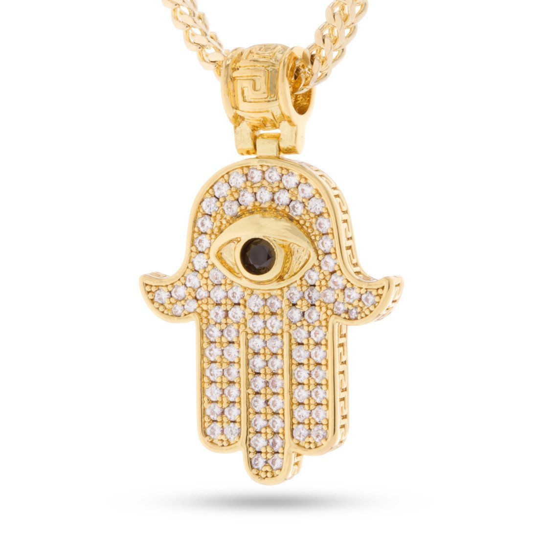 Hamsa, meaning five digits, has offered protection from the evil eye for generations. This symbolic gesture of the open right hand has said to have brought luck to those who wear it. Each piece features 14K Gold plating to offer added shine and protection, while the clear CZ stones provide value and elegance to this one-of-kind piece. Meanwhile, its 2.5mm, 20" Stainless Steel Franco Chain provides the perfect look for those looking for protection.
