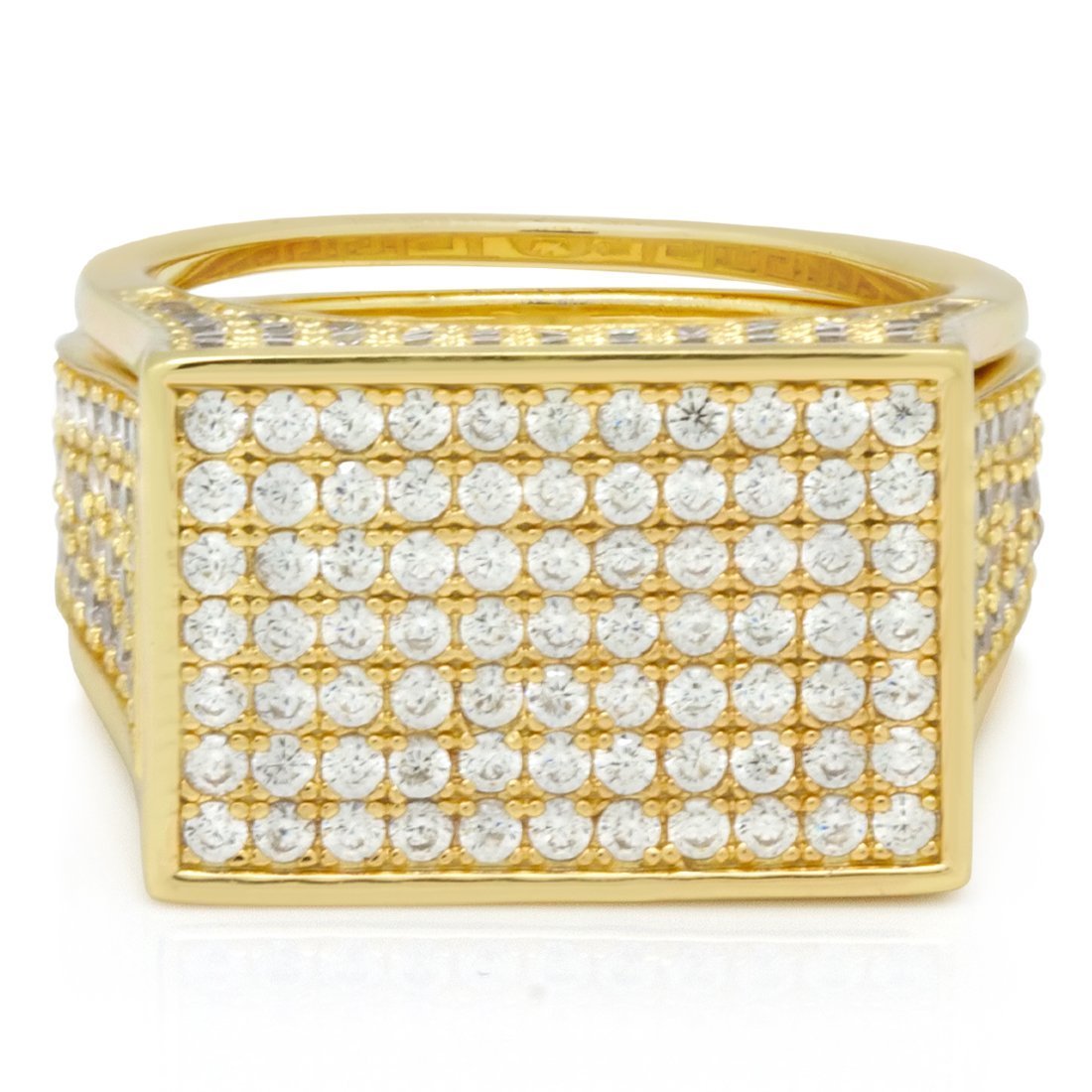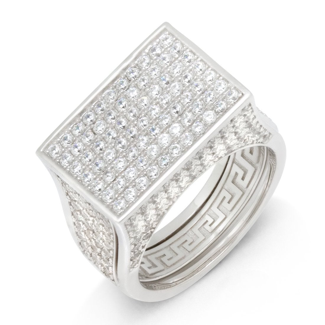 Developed in the 18th century, the Poison ring served as a way to silence enemies. Now, you can use it to store all of your hidden items into this discreet ring. Plated in 14K Gold with a sleek Greek Key design, the ring is lined with handset VVS Diamond Simulate stones.