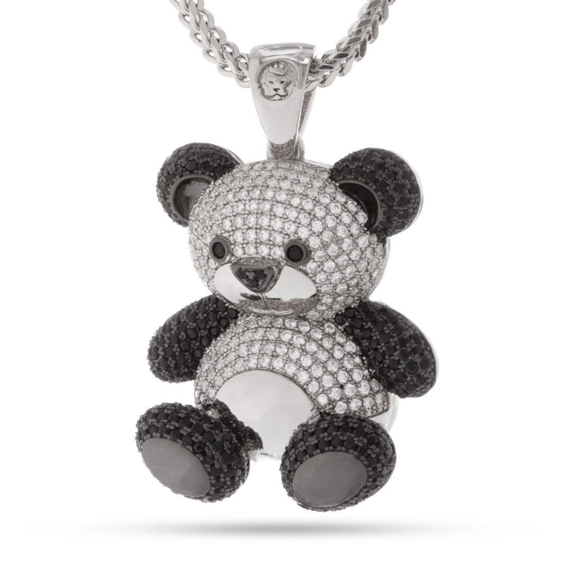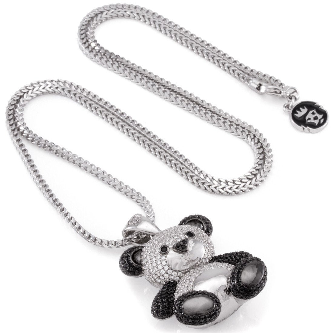 Compared to other panda bears, this Rhodium Two-Tone CZ Panda Necklace isn't soft, and it sure isn't cuddly. It's built tough to withstands the rigors of the streets, and with black rhodium plating, this solid piece provides added shine and durability, while the black and clear CZ stones add that iconic hip-hop look to this piece. Each features a 24" 2.5mm stainless steel Franco chain to match with the Greek Key casing featured on the back of each pendant.