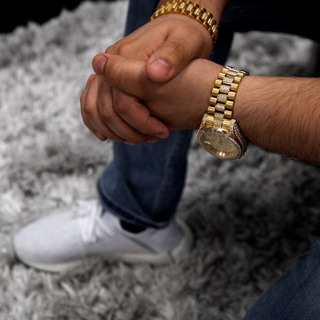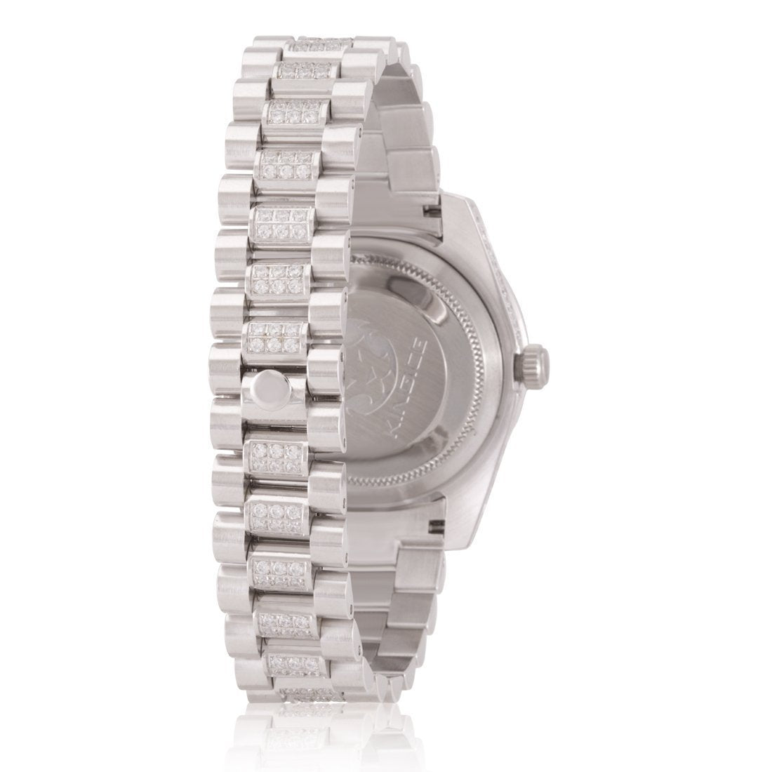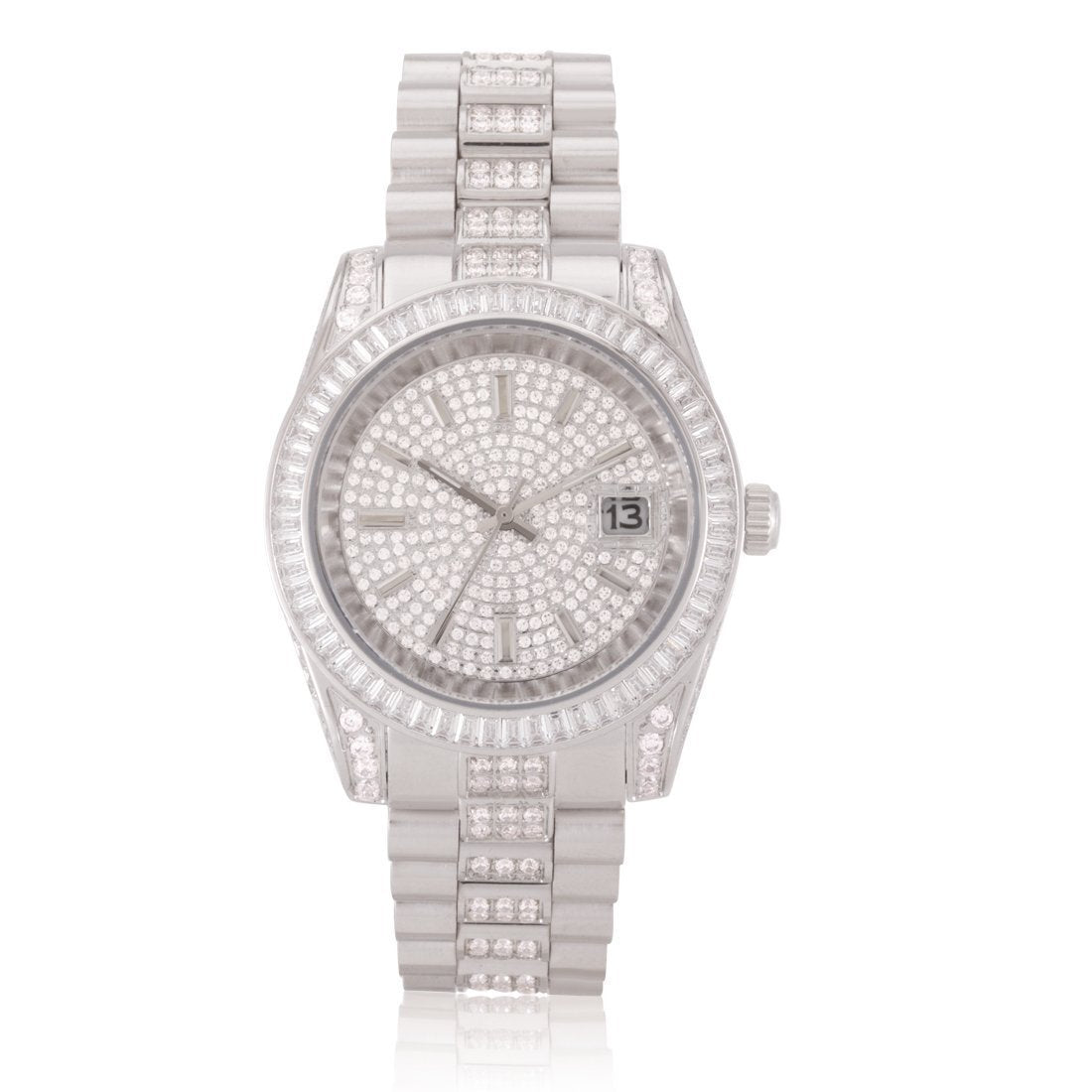 Built for a man with class, The Royal Iced Watch comes lined with handset VVS Diamond Simulate stones to give this watch a high class look and feel. The Royal features a magnified date along side its 3/4" wide band.