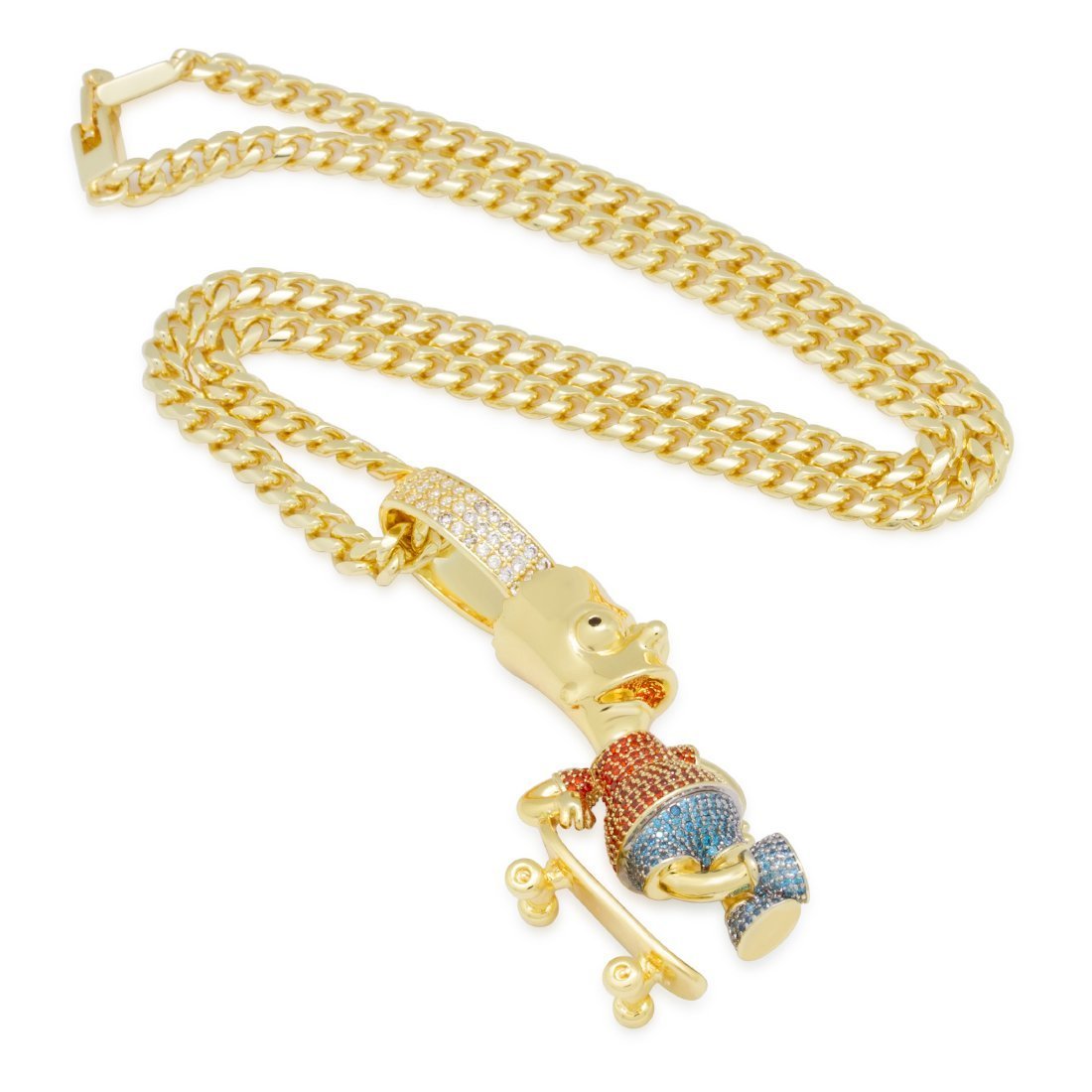 Part of the official Simpsons x King Ice collaboration, the new Cruiser Bart Necklace has a full 3D design of Bart with his skateboard. More than 500 lab created diamond simulates decorate Bart's iconic red t-shirt and blue shorts. His shoes are iced with more blue stones. The pendant has been dipped five times in 14K Gold plating for a bright finish. Each pendant comes paired with a 5mm, 20" Miami Cuban chain.