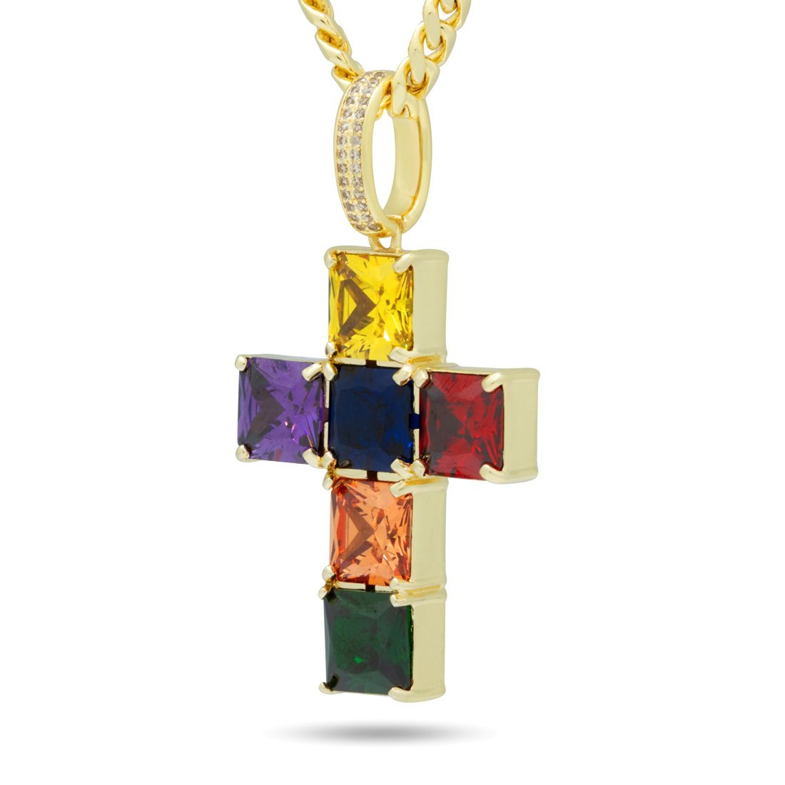 The Spectrum Cross Necklace is iced with multicolored VVS Diamond Simulates to form the spectrum rainbow. The 14K Gold plated necklace has Greek Key design on the back for a subtle finish. Each necklace is paired with a 5mm Miami Cuban Chain 20".