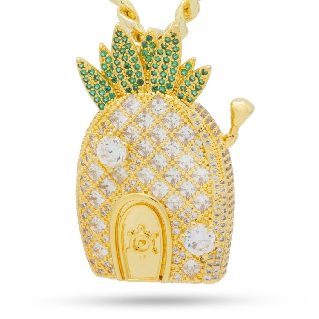 "Who lives in a pineapple under the sea?" Part of the official SpongeBob x King Ice collaboration, the Pineapple House necklace is covered in round VVS Diamond Simulates. Clear and green colored stones detail the house everybody knows. The iced pendant has a 14K Gold plating to complete the look. Each necklace comes with a 5mm, 20" Miami Chain.