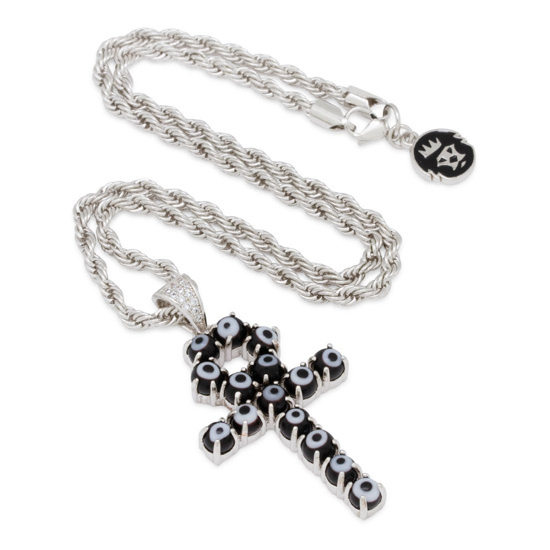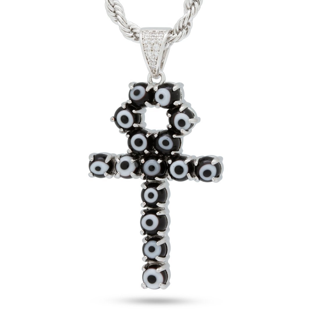 Combining the Ankh Cross and Evil Eyes symbolizes the beauty of life and offers protection from all harm. Each unique design provides a vibrant display of black evil eye beads and white gold plating that sets the standard for street wear jewelry. Each piece is paired  with a 4mm, 20" Rope Chain.