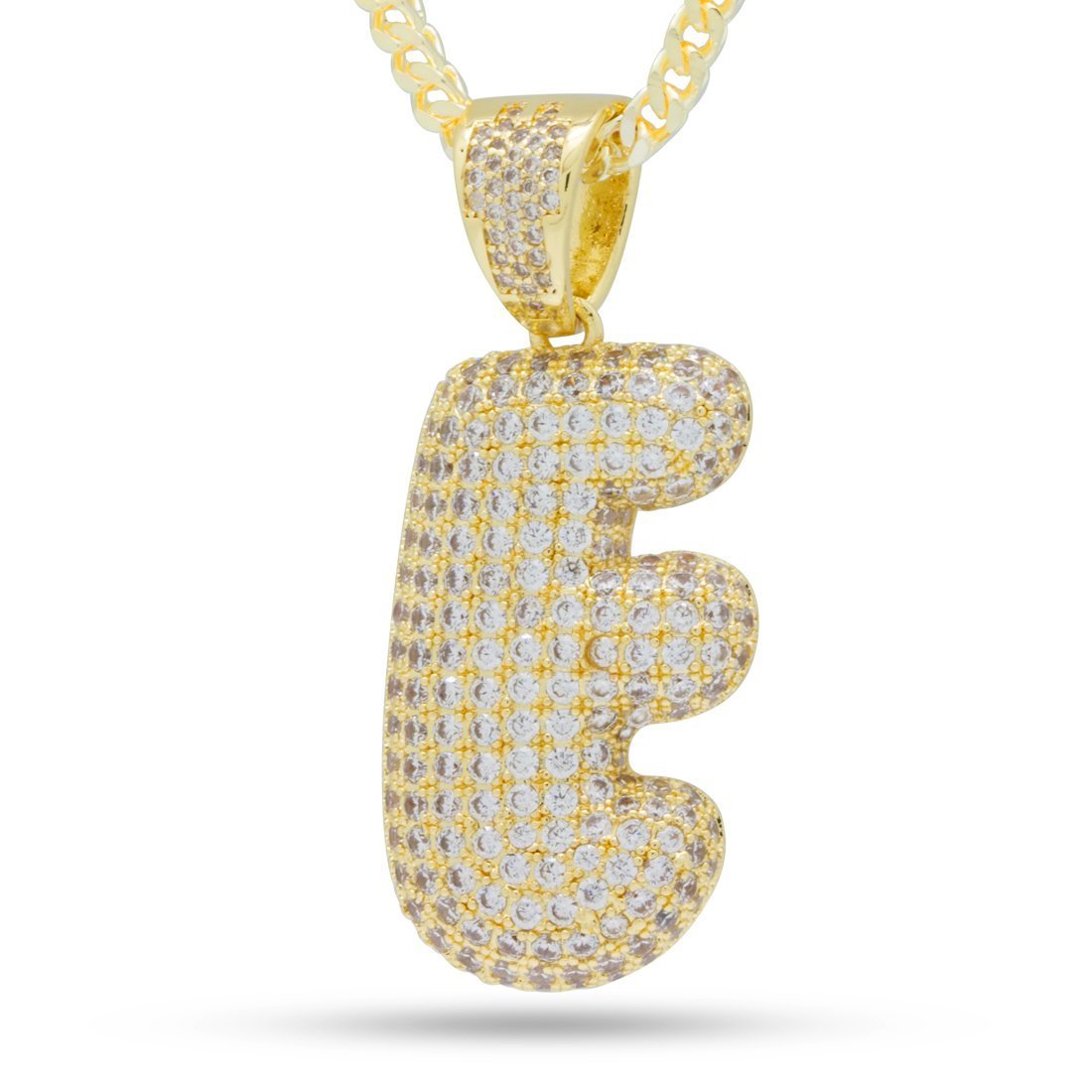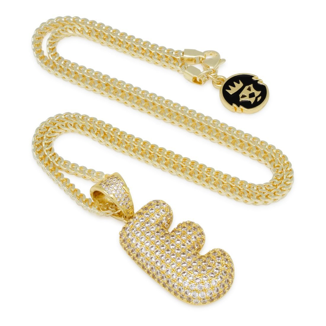 Plated in 14K Gold and lined with clear VVS Diamond Simulates, the Bubble Letters create an iconic street wear staple piece. Each piece belonging to the collection features a 2.5mm 14K Gold plated, 20" Franco chain to complete its look.
