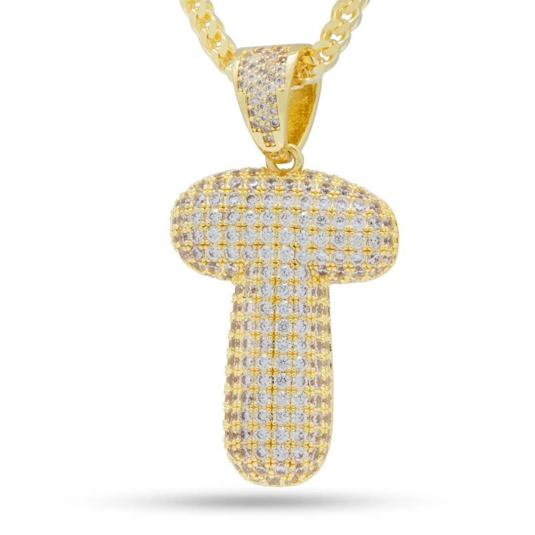 Plated in 14K Gold and lined with clear VVS Diamond Simulates, the Bubble Letters create an iconic street wear staple piece. Each piece belonging to the collection features a 2.5mm 14K Gold plated, 20" Franco chain to complete its look.