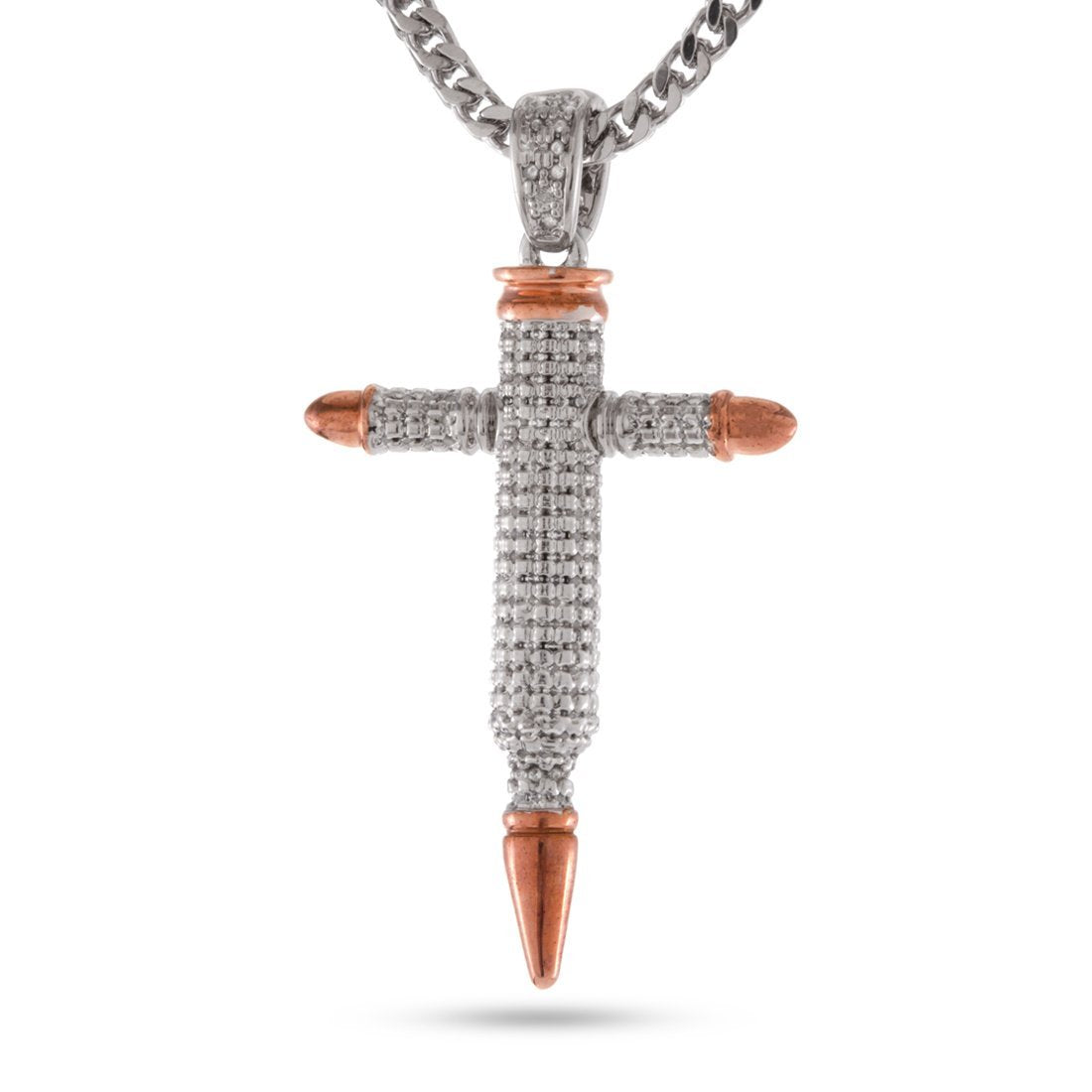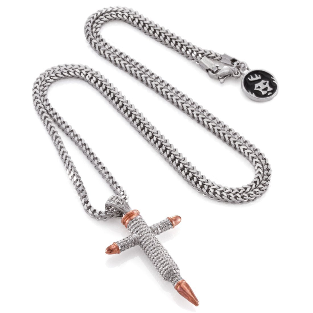 What prayers cannot fix, bullets can, and when the Lord’s angels cannot protect you, you must fight for survival. Giving you a newest cross idea comes the white gold Bullet Cross necklace that features AAA, handset stones and includes genuine White Gold plating. Each Bullet cross features a stainless steel, 2.5mm, 26” Franco chain.